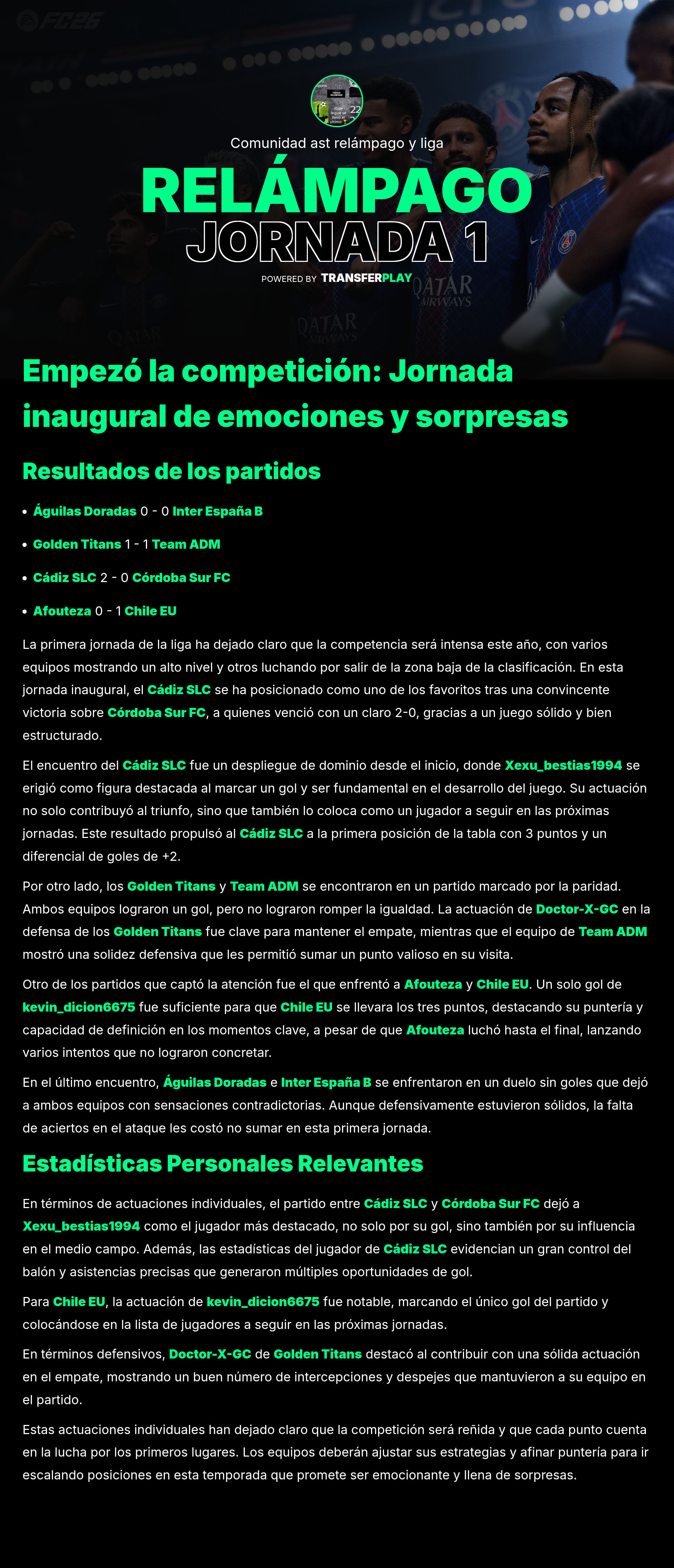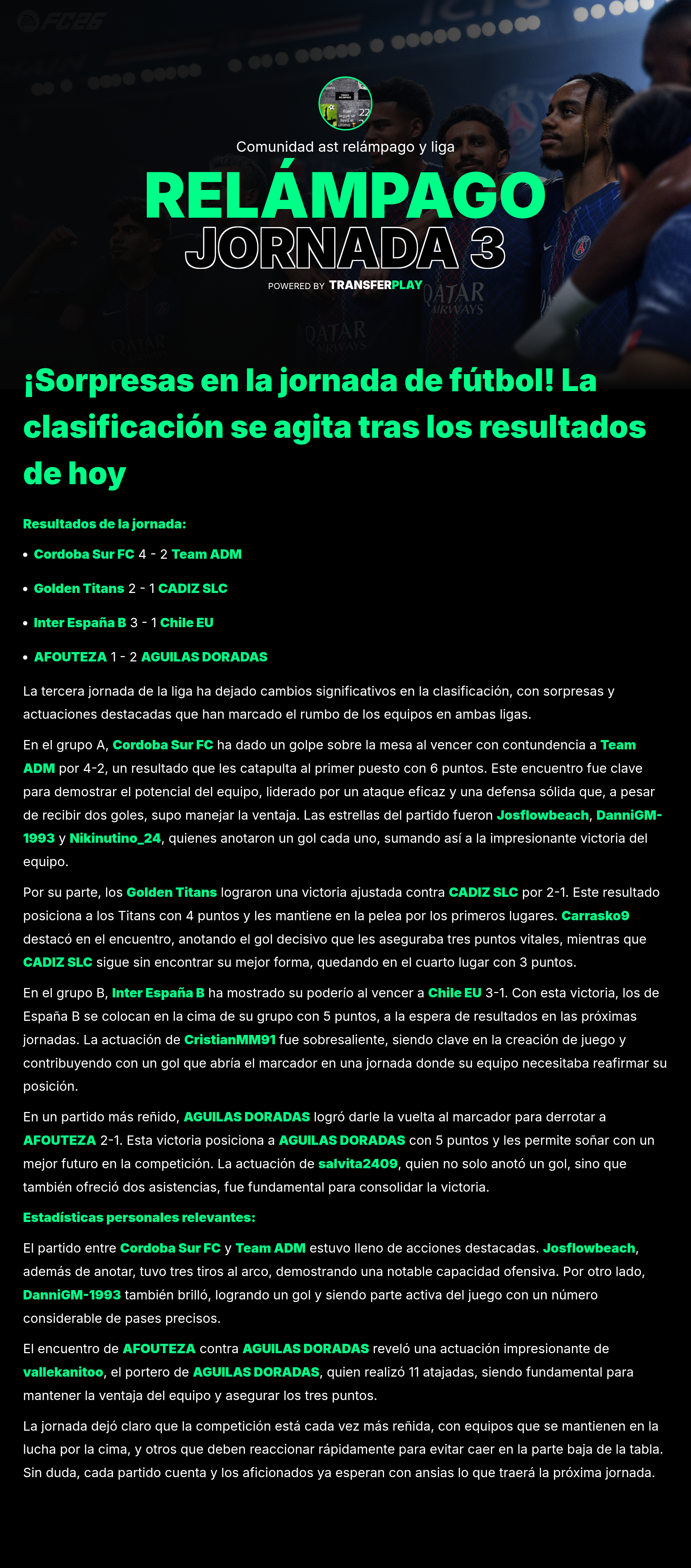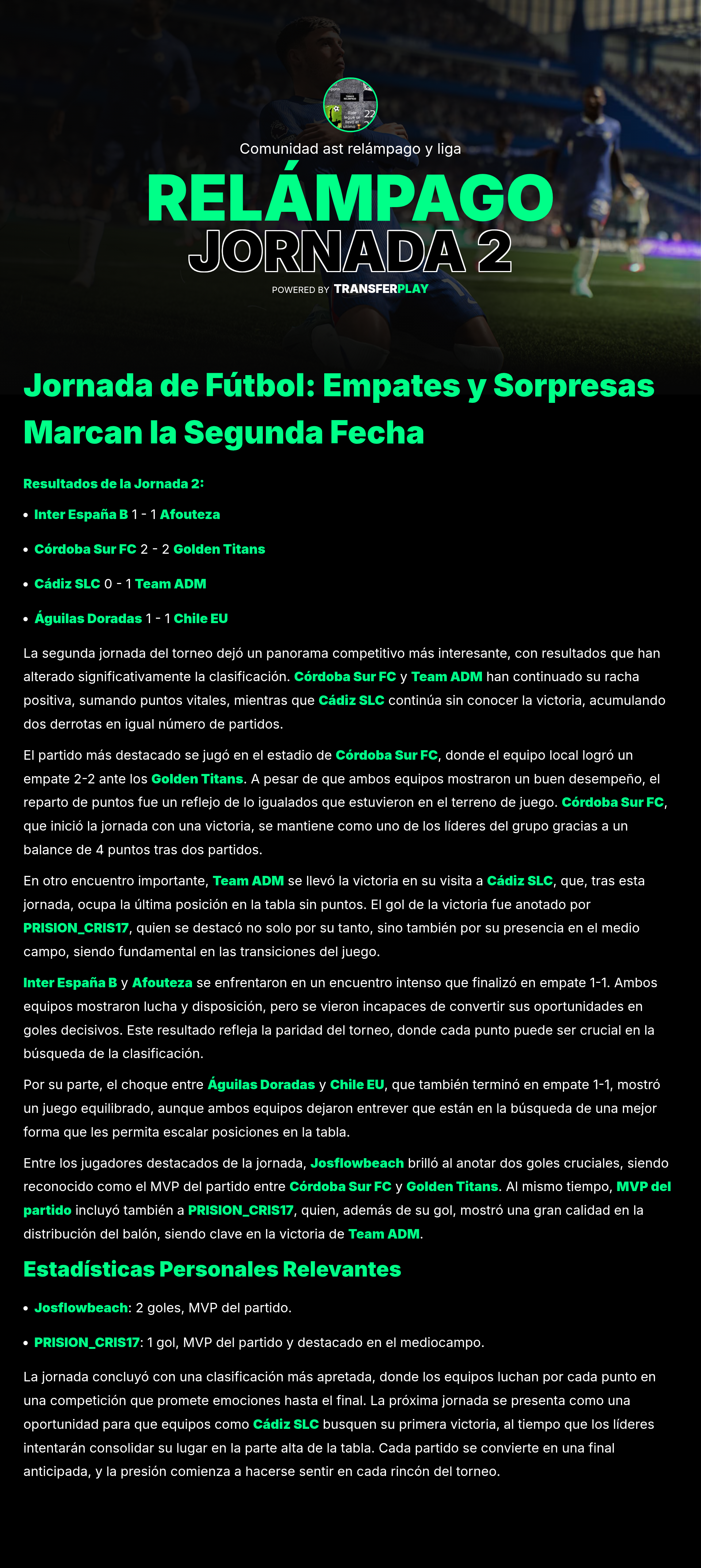 Córdoba Sur FC se impuso a Team ADM con un emocionante 4-2. Un partido lleno de goles que mantuvo a los seguidores al borde de sus asientos. DanniGM-1993 y Nikinutino_24 anotaron, pero Josflowbeach brilló con un gol y un gran desempeño en el campo.