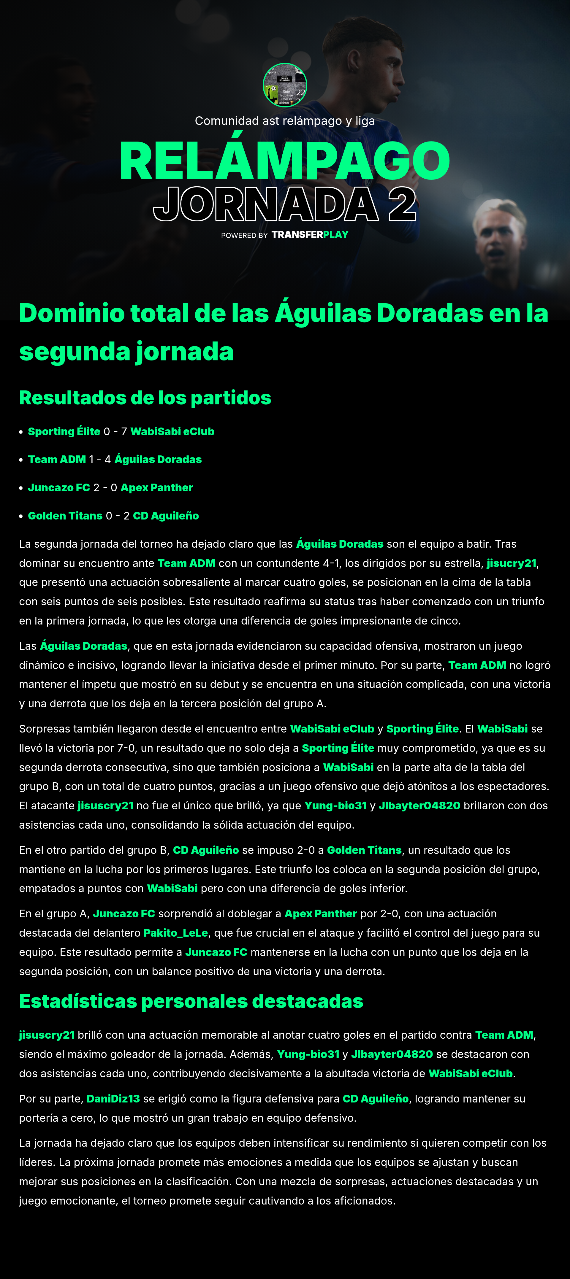 Un emocionante 2-2 fue el resultado de Juncazo FC contra AGUILAS DORADAS. Ambos equipos mostraron su garra, pero ninguno se llevó los tres puntos en un partido lleno de oportunidades y emoción.