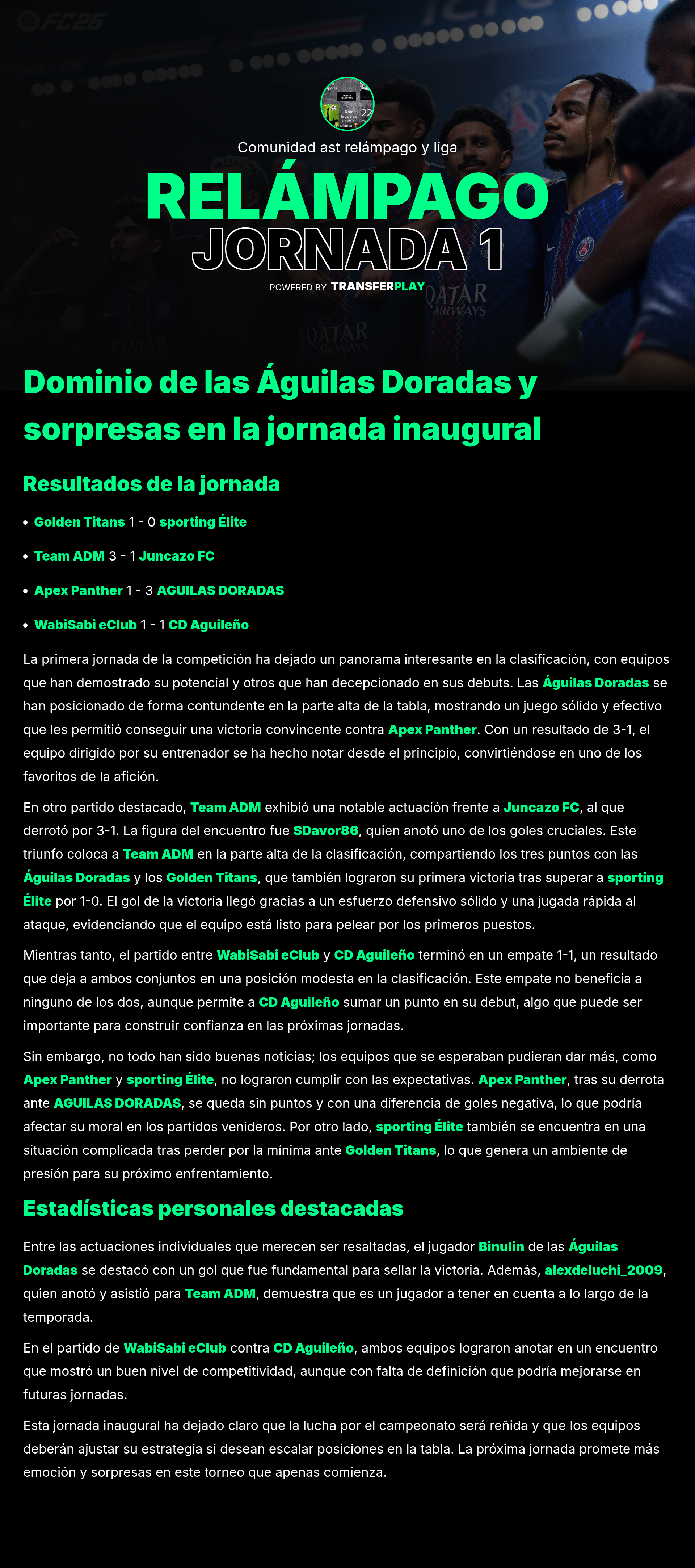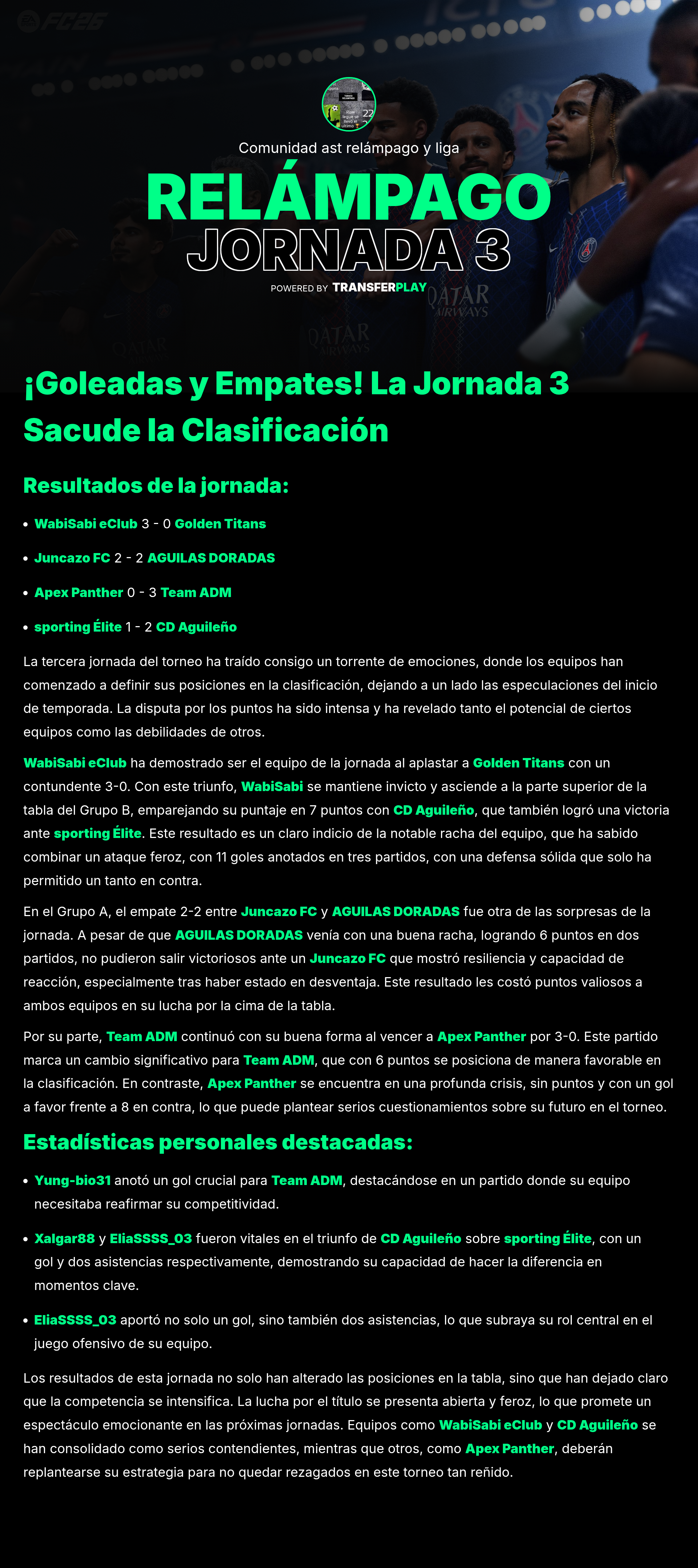 En un partido que dejó claro quién manda en el campo, WabiSabi eClub arrasó a Golden Titans con un 3-0. El equipo local mostró una gran cohesión y estrategia, dejando a su rival sin respuesta. ¡Un gran espectáculo para los fans!