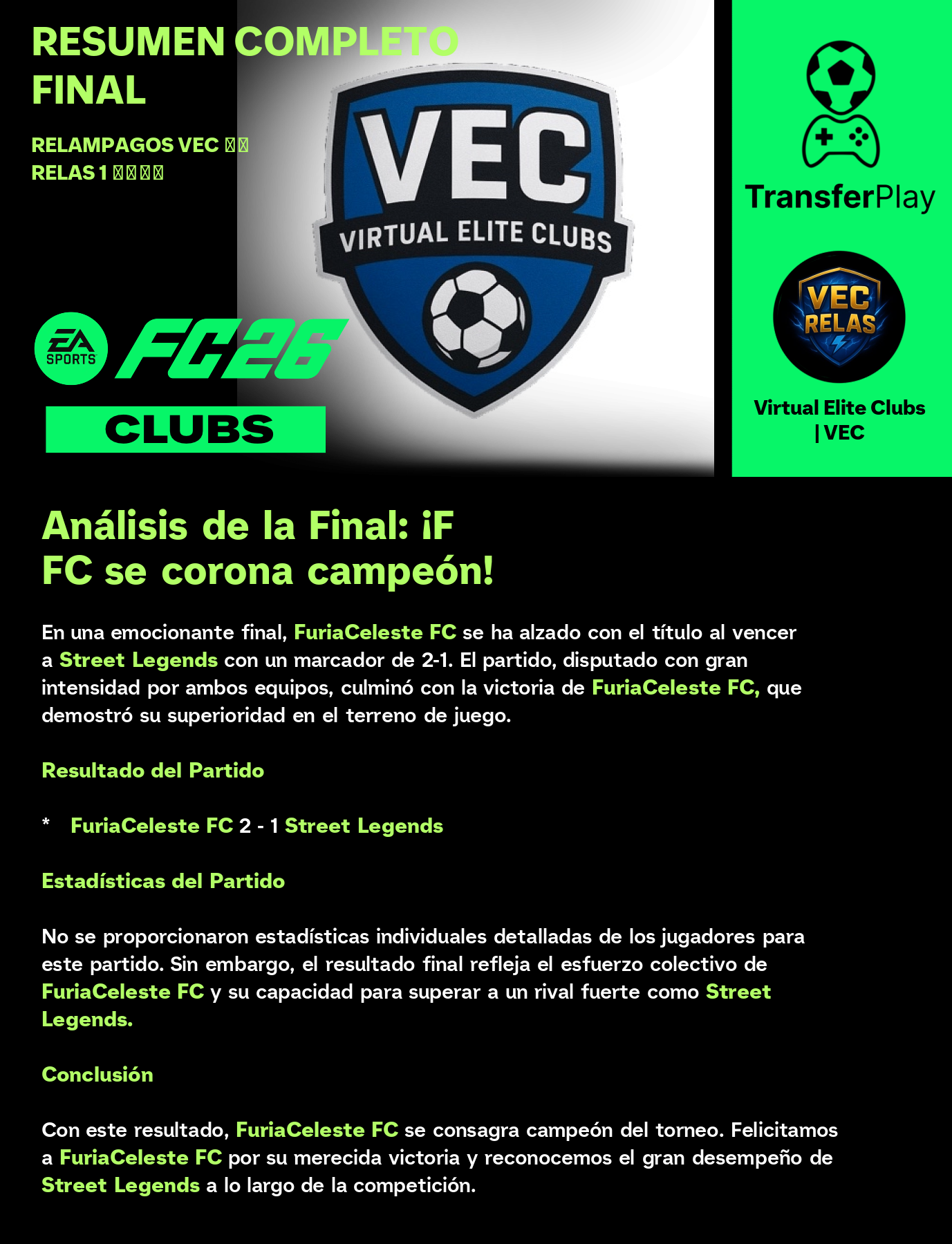 Con un marcador ajustado de 2-1, FuriaCeleste FC logró superar a Street Legends en la final, llevándose el título. ¡Un partido lleno de emoción y garra que mantuvo a los fans al borde del asiento!