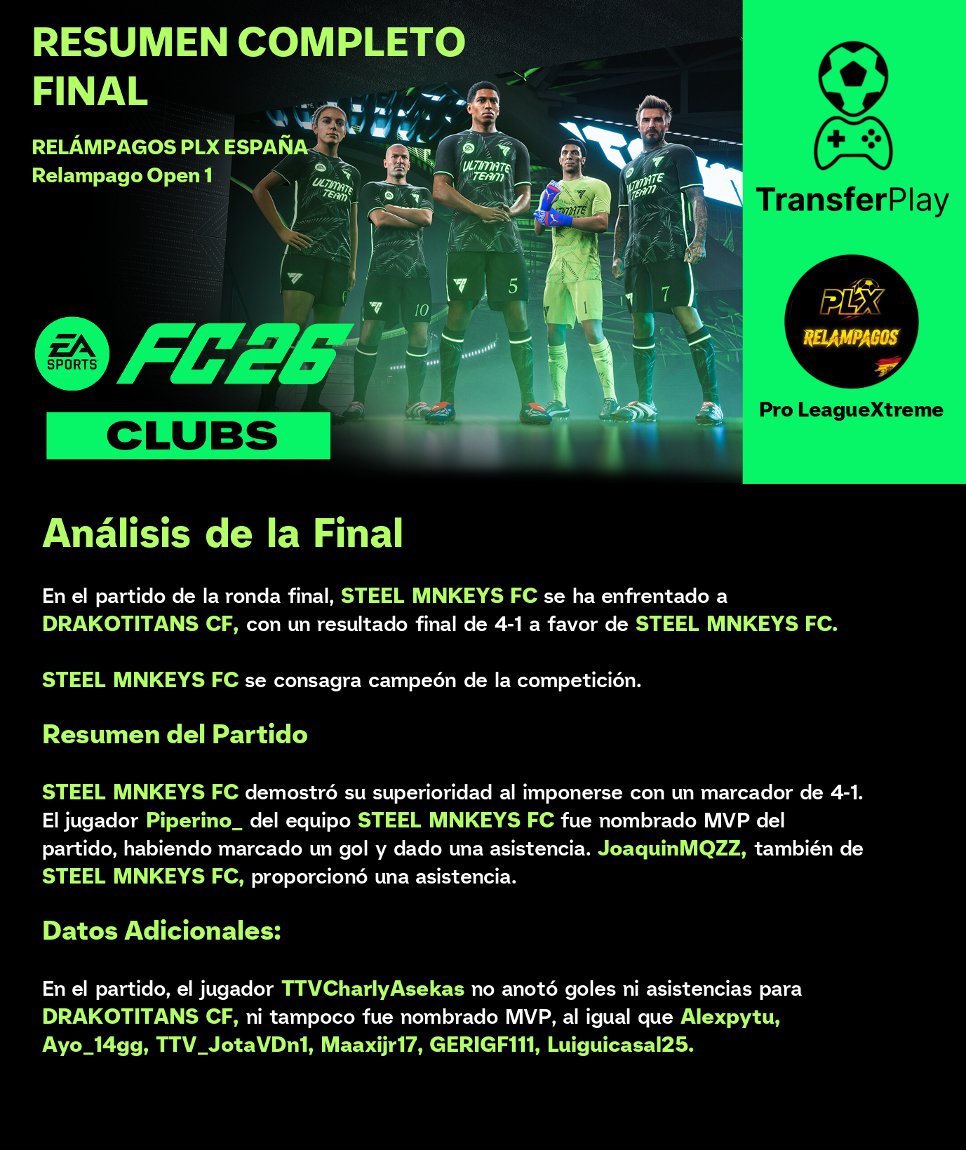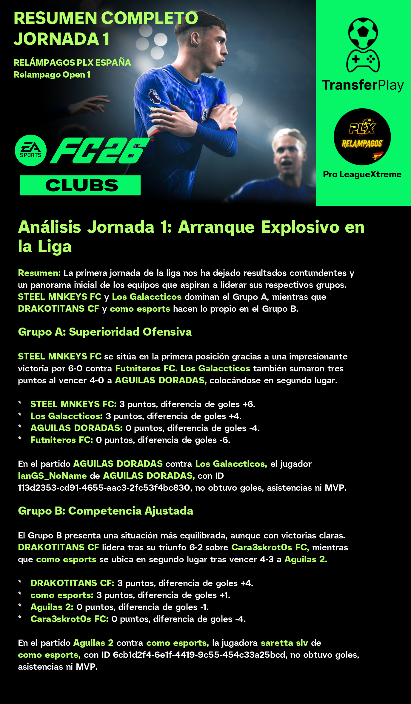 En un partido que nadie esperaba, 'como esports' demostró que la garra puede más que el nombre, venciendo a 'Cara3skrot0s FC' por 1-0. ¡A seguir así, cracks!