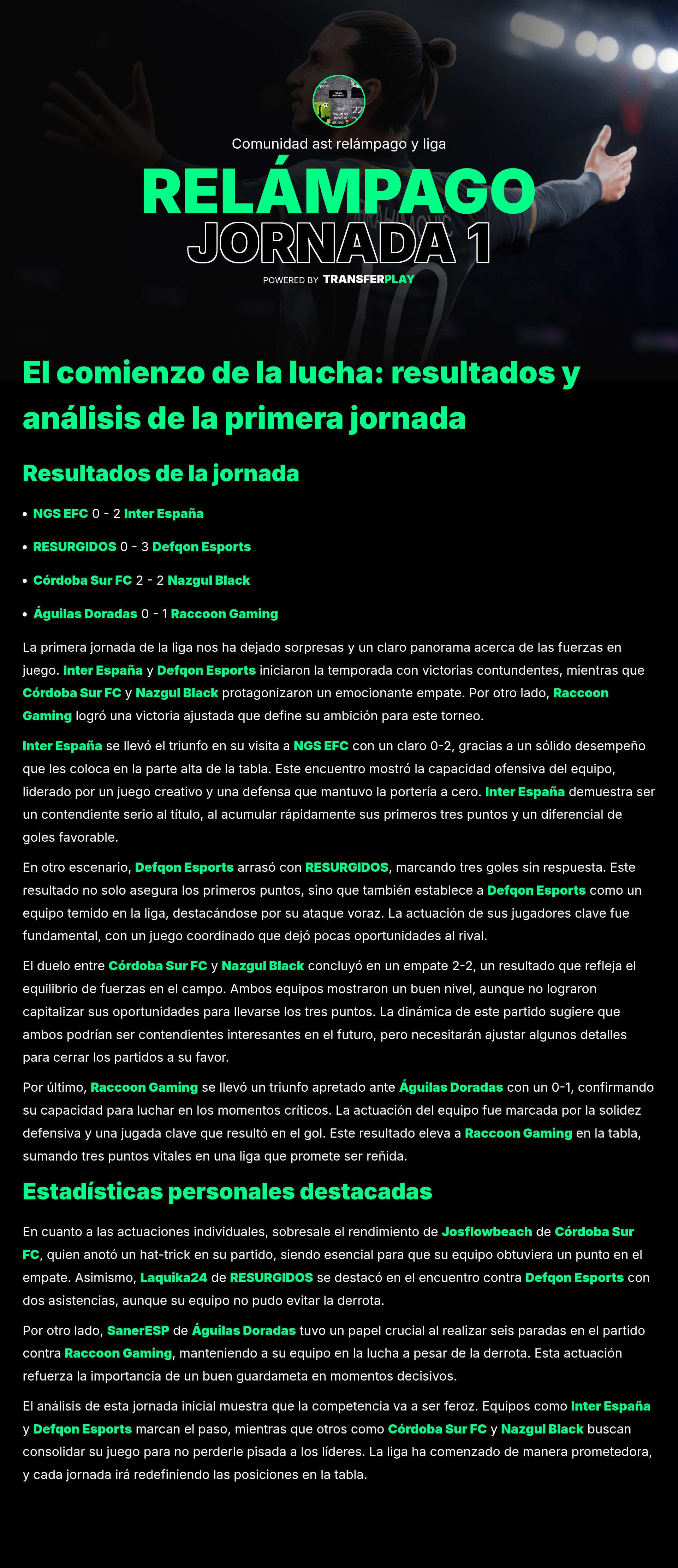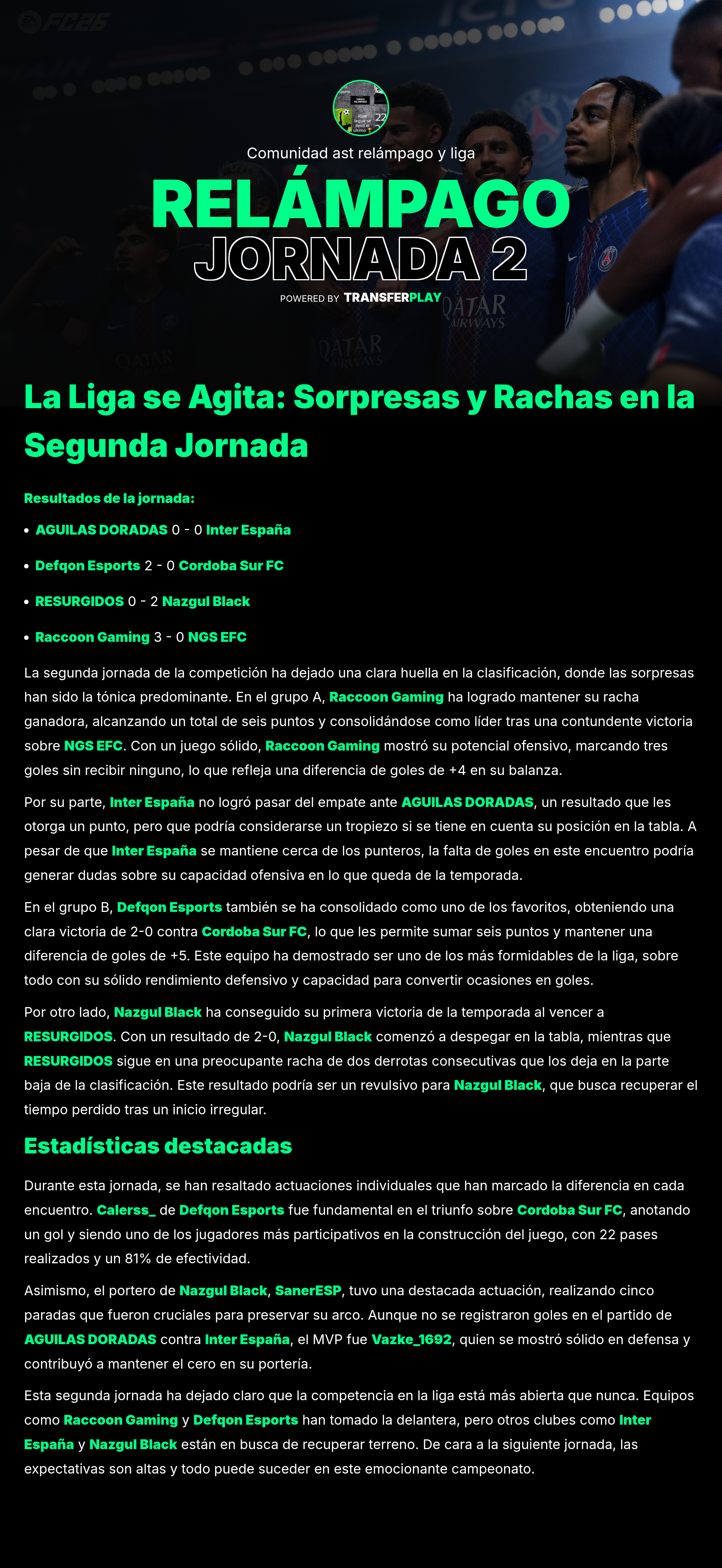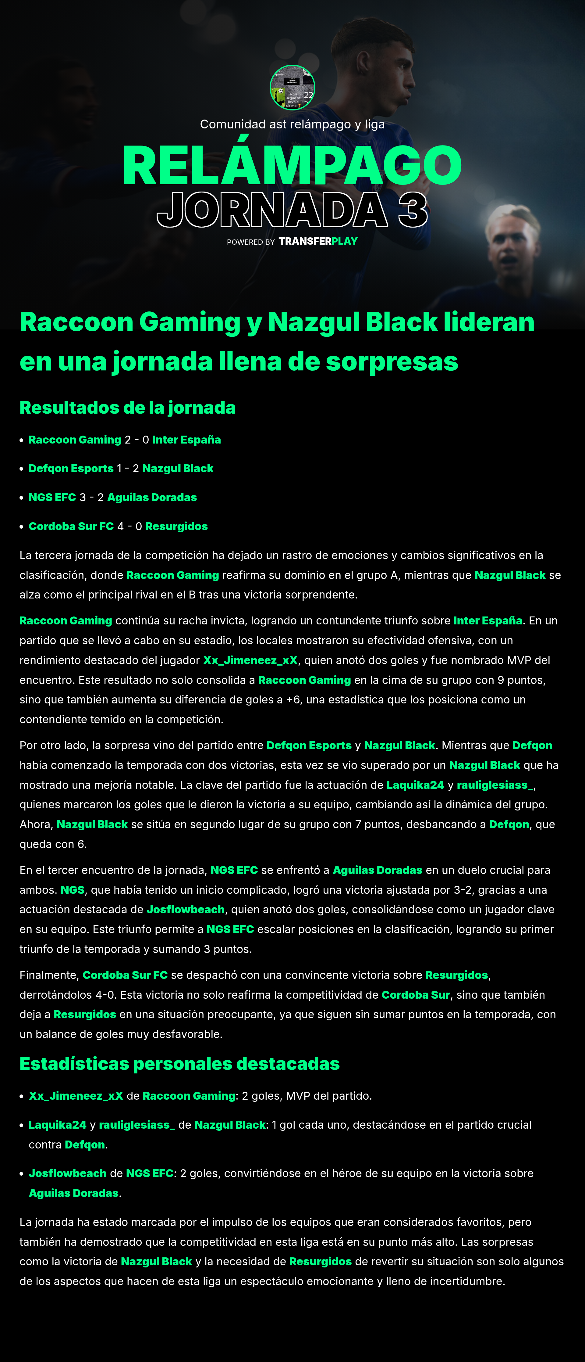 Raccoon Gaming se impuso 2-0 a Inter España con un juego sólido y eficiente. Xx_Jimeneez_x fue la estrella del partido, anotando dos goles y ganando el premio MVP. Con esta victoria, Raccoon Gaming sigue mostrando su potencial en la jornada 3.