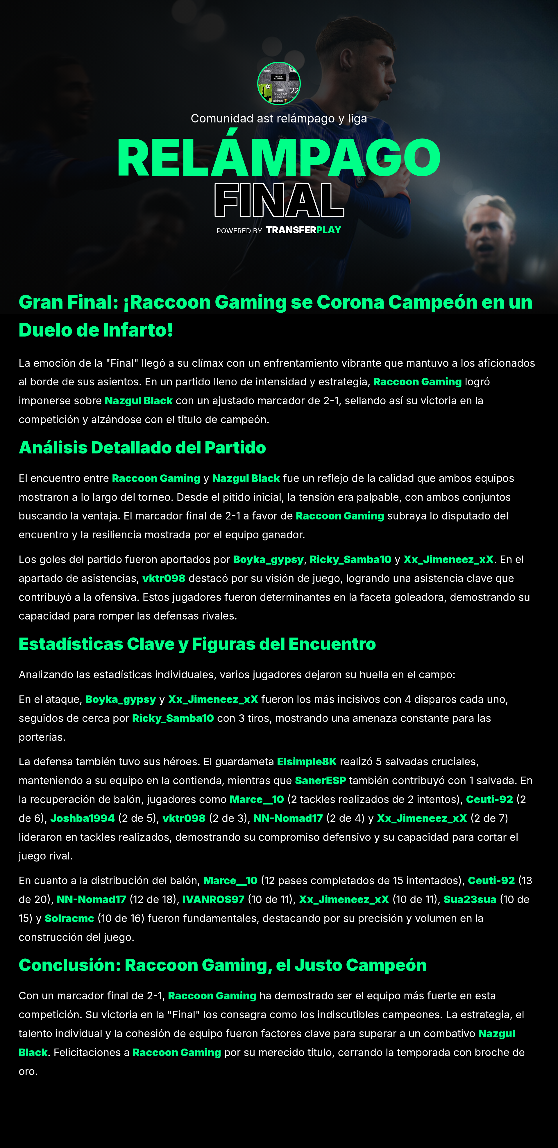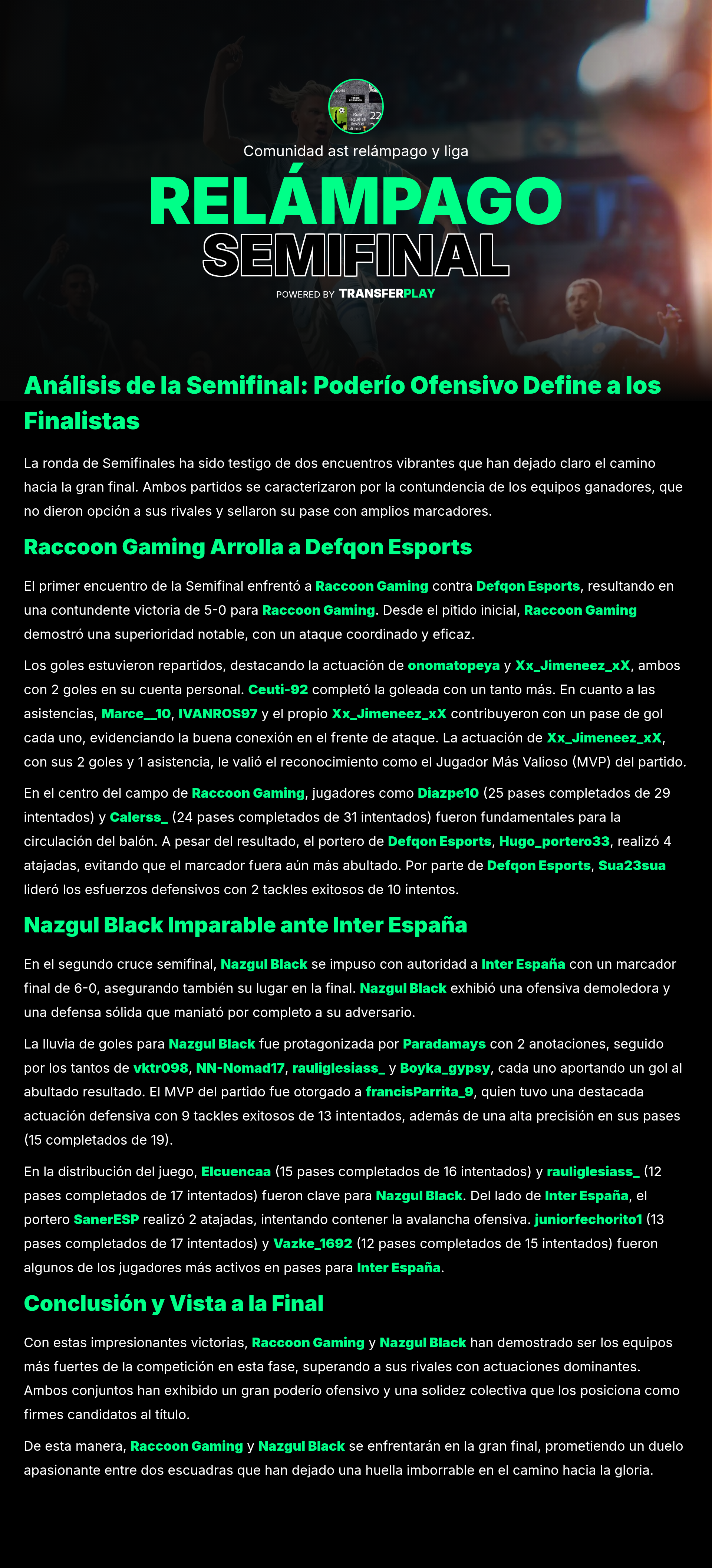 Laquika24 y rauliglesiass_ fueron fundamentales en la victoria de Nazgul Black, anotando cada uno un gol que les permitió llevarse el triunfo de 2-1 ante Defqon Esports.