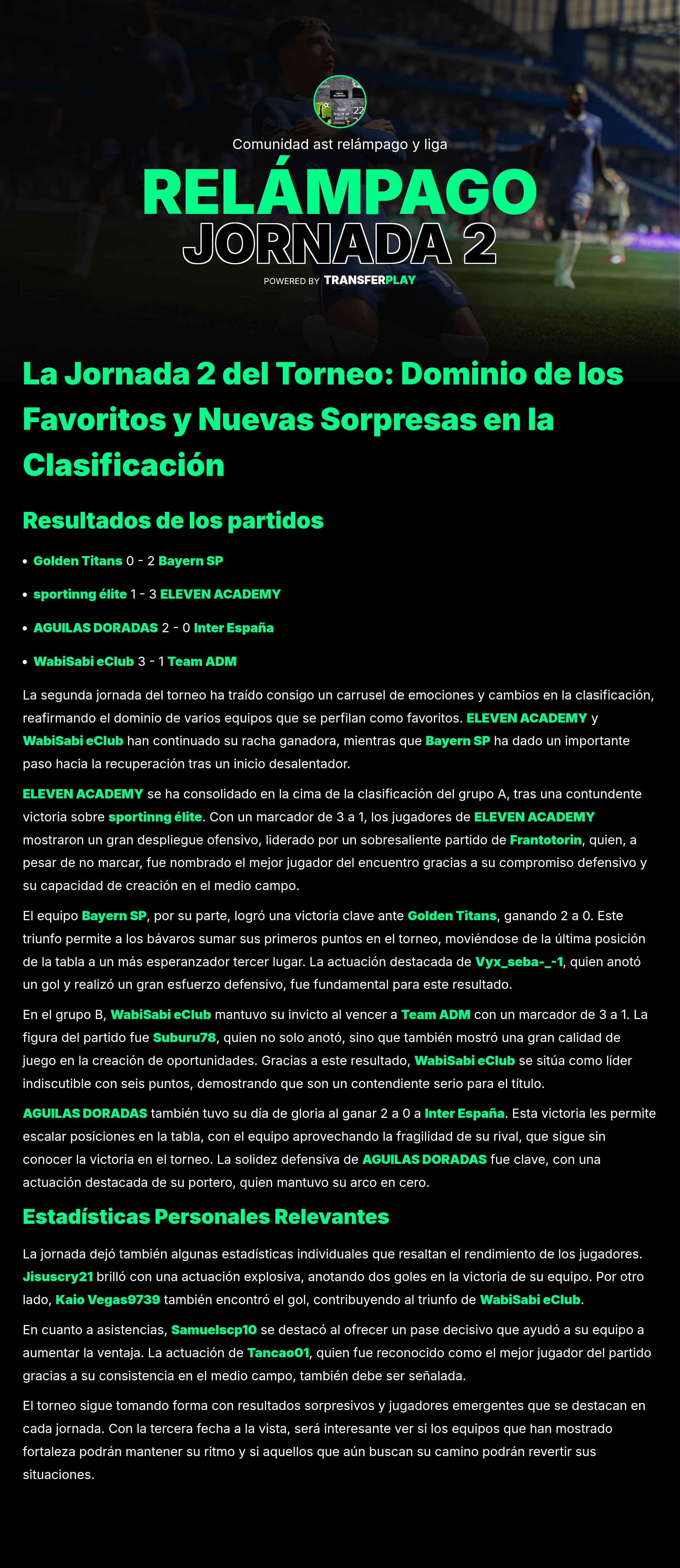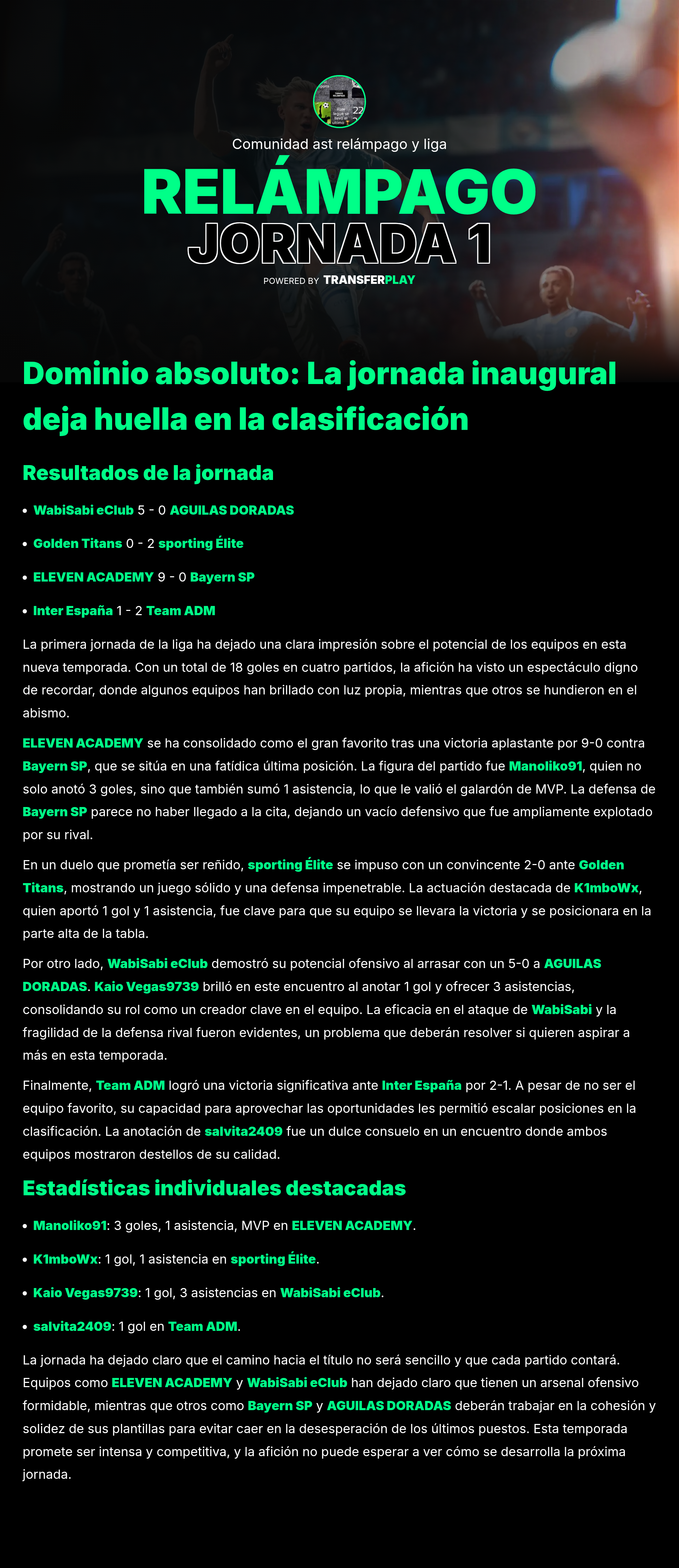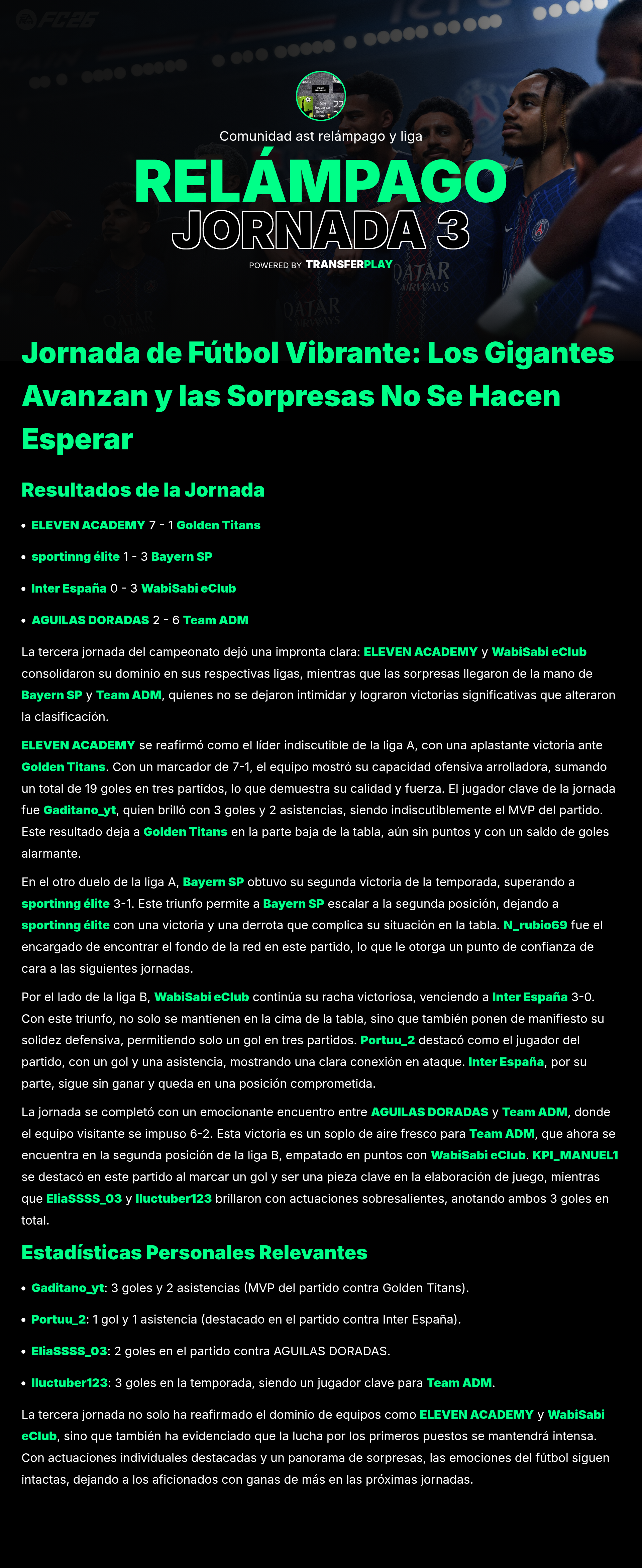 En un partido de locura, Eleven Academy arrolló a los Golden Titans con un impresionante 7-1. Gaditano_yt brilló con 3 goles y 2 asistencias, demostrando que es un verdadero crack. Mientras tanto, los Titans buscarán recuperar el rumbo después de este duro golpe.