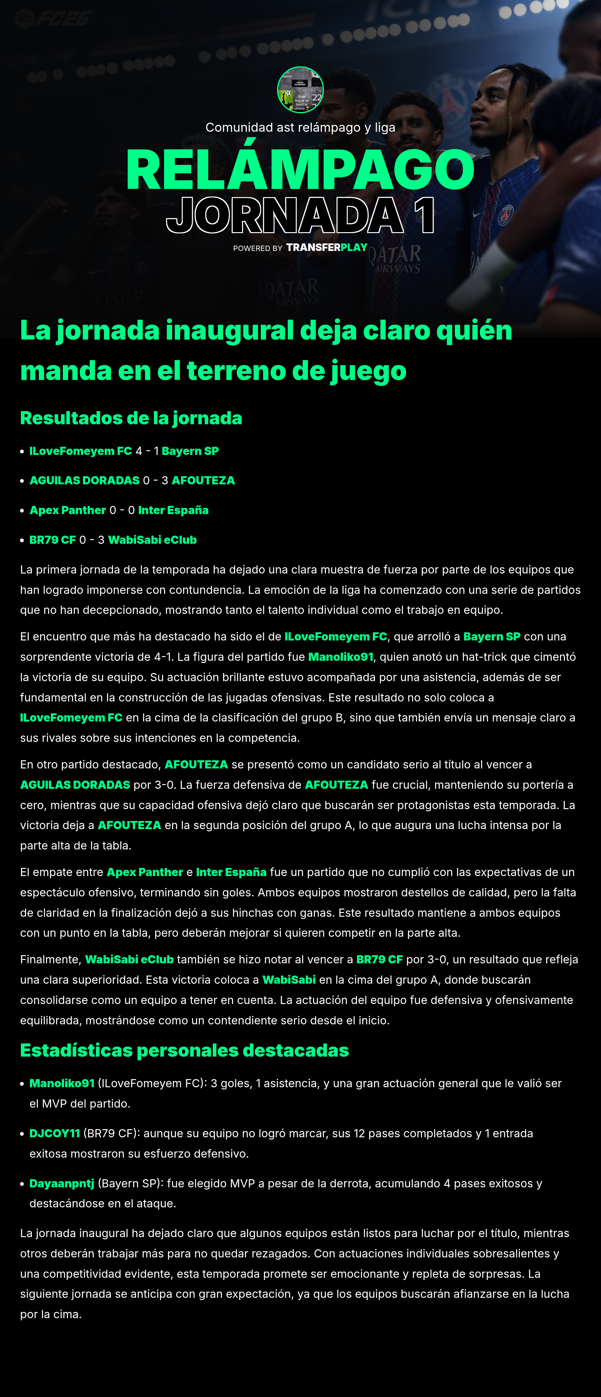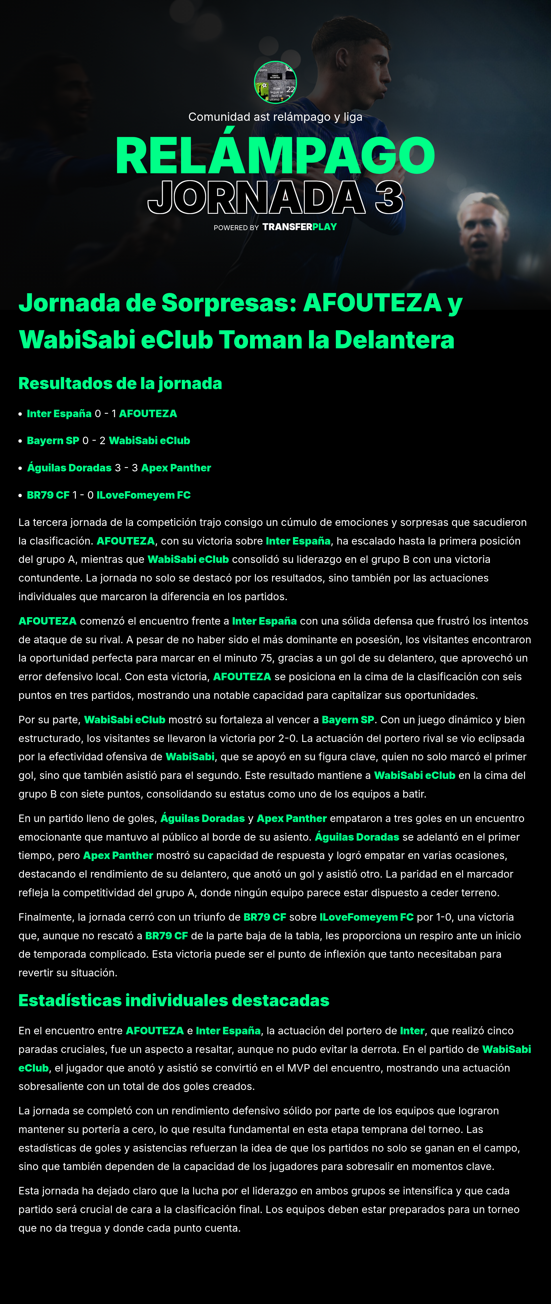 Con una actuación excepcional, Istateclapeain02 anotó un gol y mostró su calidad en el campo, siendo fundamental para la victoria de WabiSabi eClub.