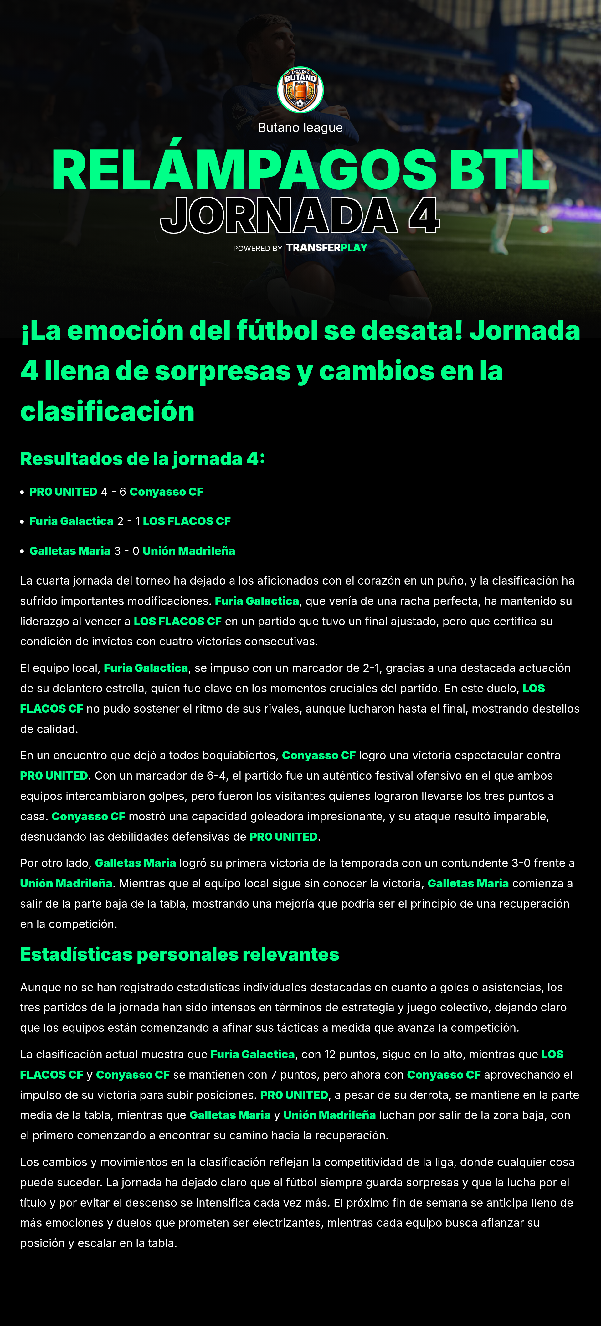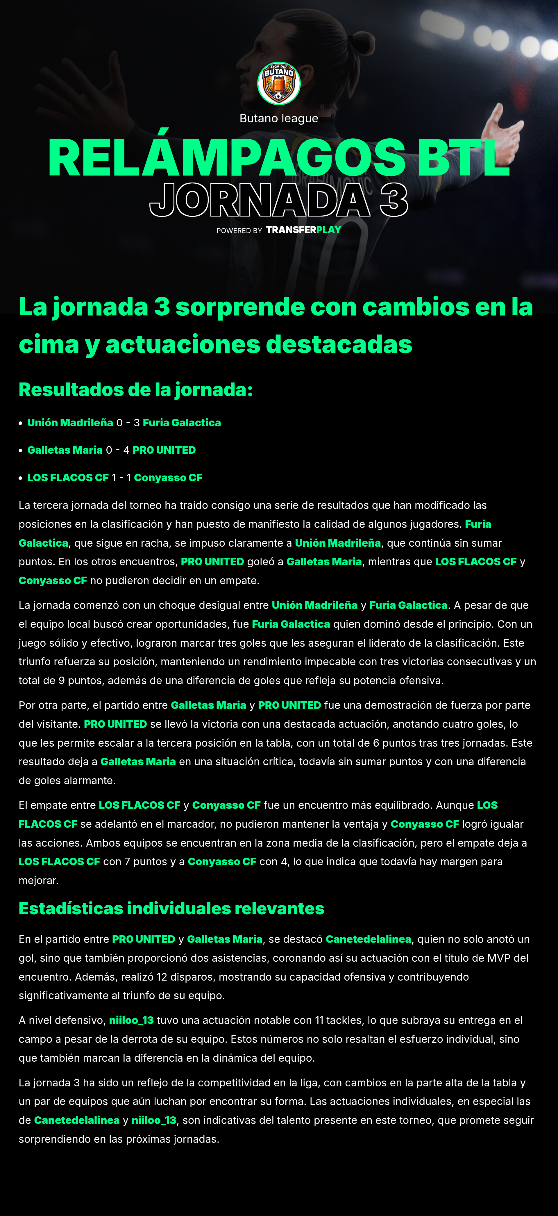 En un encuentro emocionante, Furia Galáctica se llevó una victoria contundente de 3-0 contra Galletas María. El equipo mostró un gran dominio en el campo desde el inicio del partido, dejando claro que están en una forma impresionante. ¡Esta victoria los deja en la pelea por los puestos de arriba!