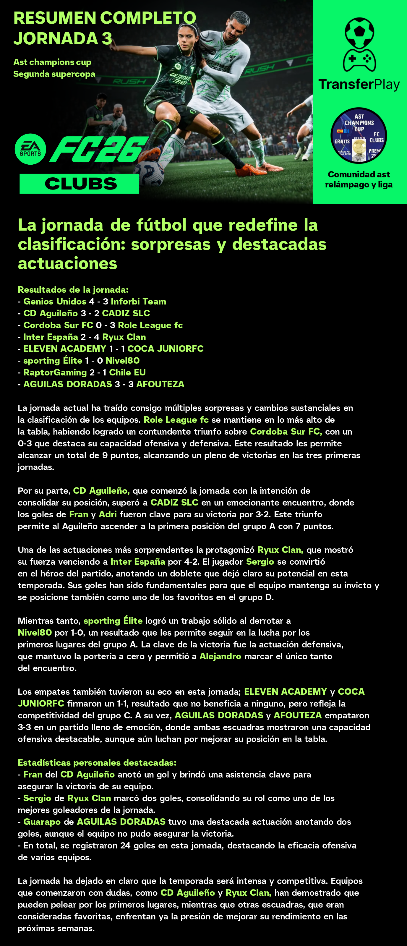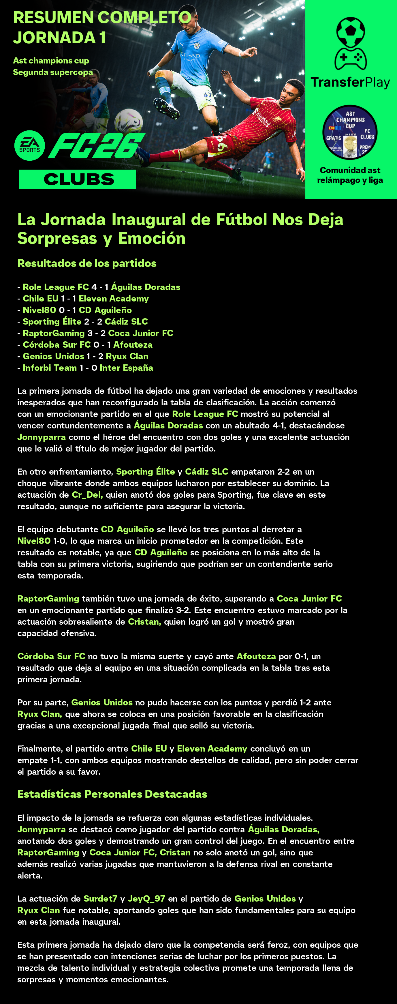 En un partido donde cada gol contaba, Genios Unidos logró una victoria emocionante por 4-3 ante Inforbi Team. Adrini45 destacó con dos goles y una asistencia, llevando a su equipo al triunfo en un duelo que mantuvo a los espectadores al borde de sus asientos.