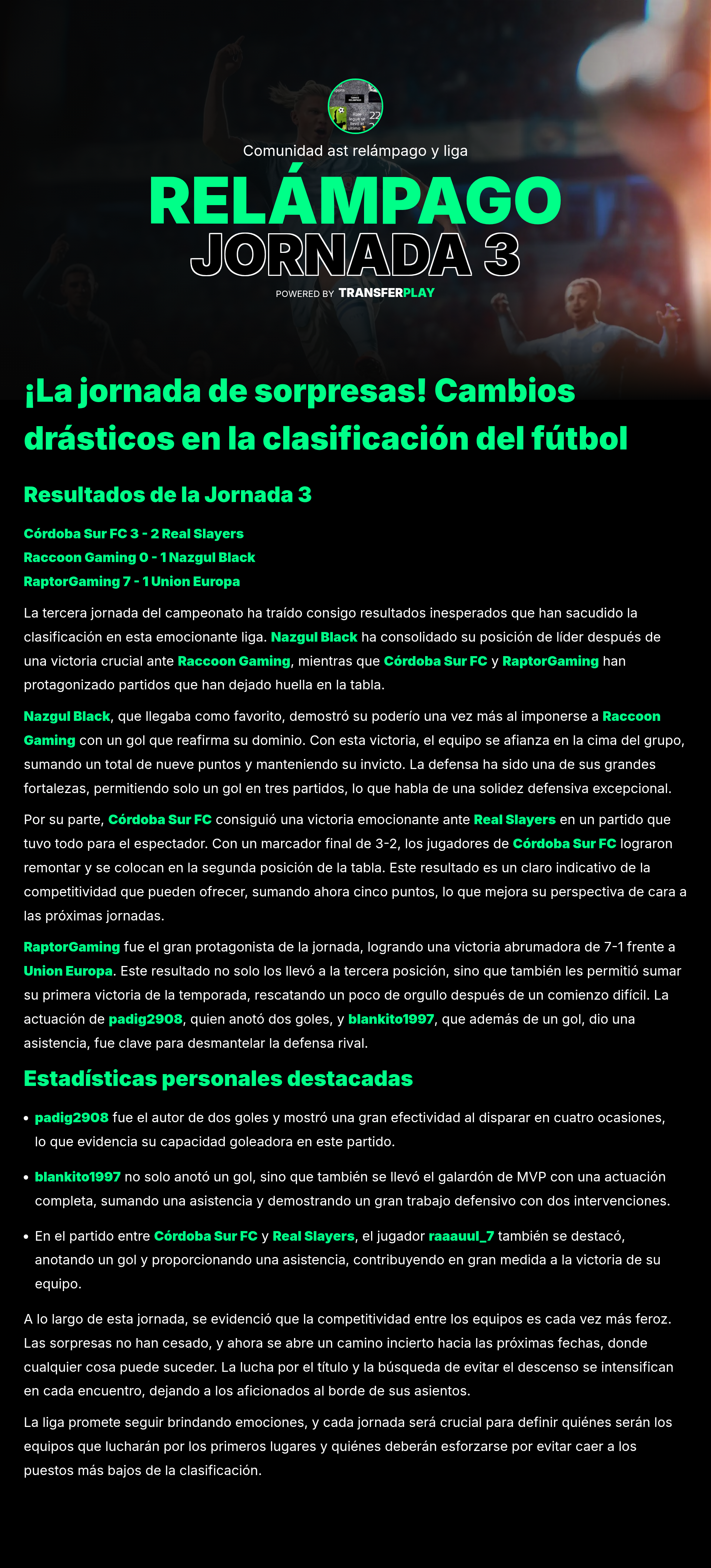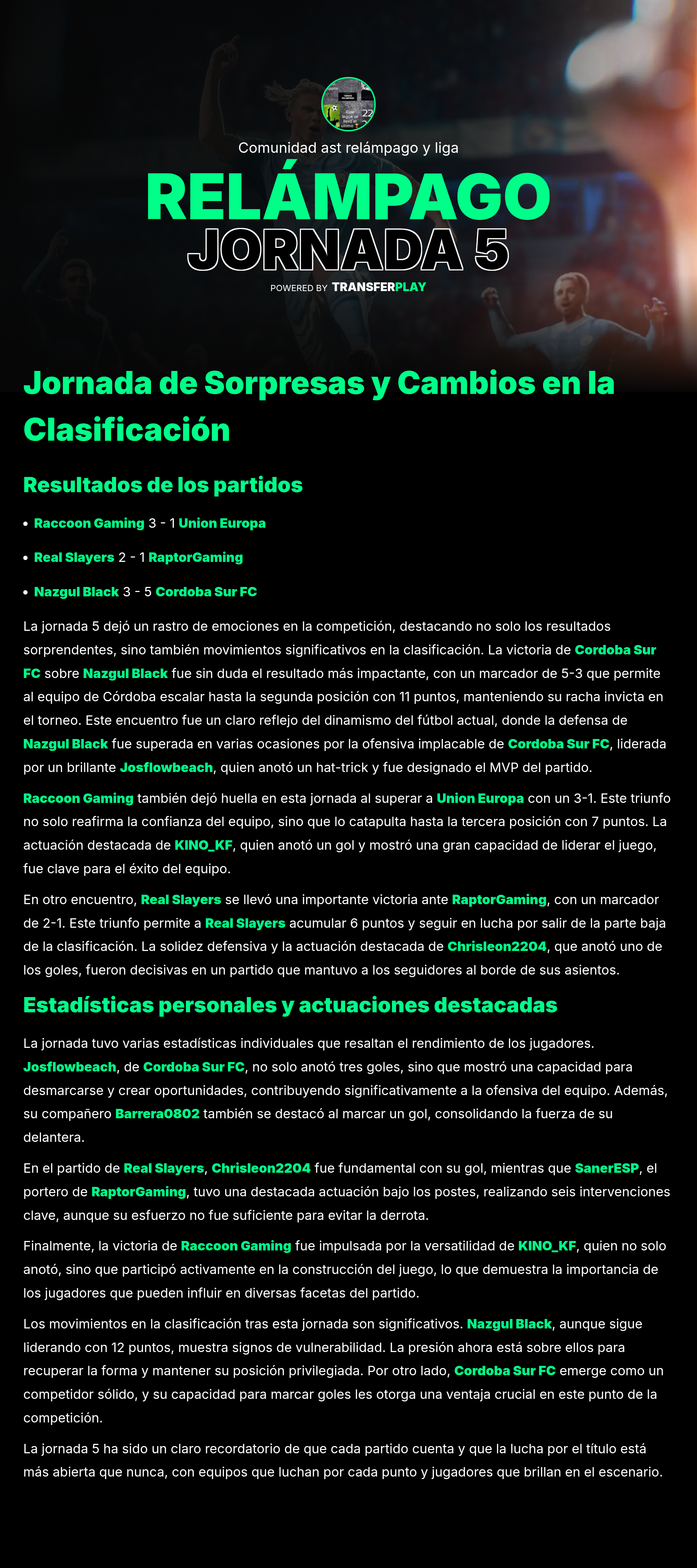 A pesar de la derrota, Josflowbeach dejó una fuerte impresión al anotar un hat-trick en el partido contra Cordoba Sur FC. Su talento fue innegable, aunque el equipo no pudo capitalizar sus esfuerzos.
