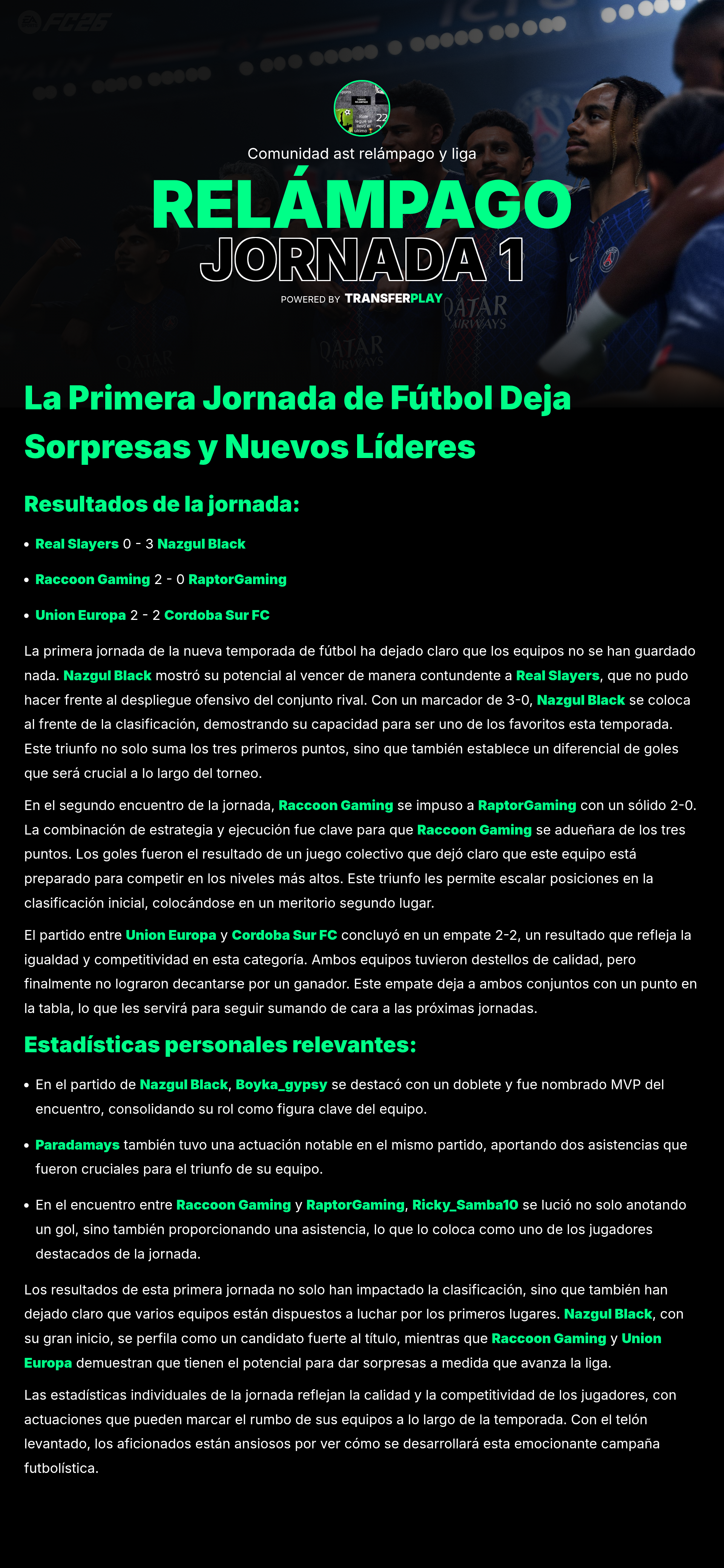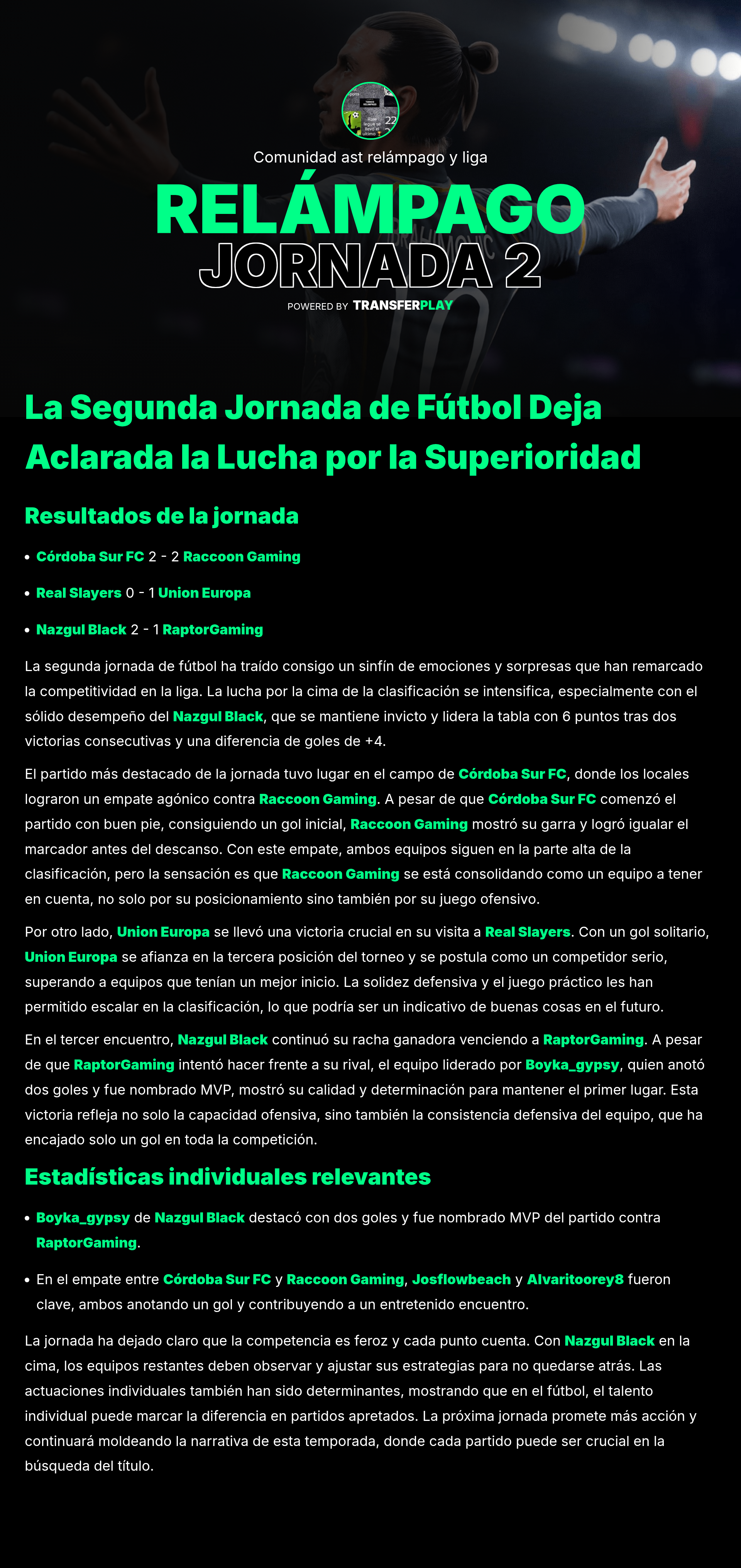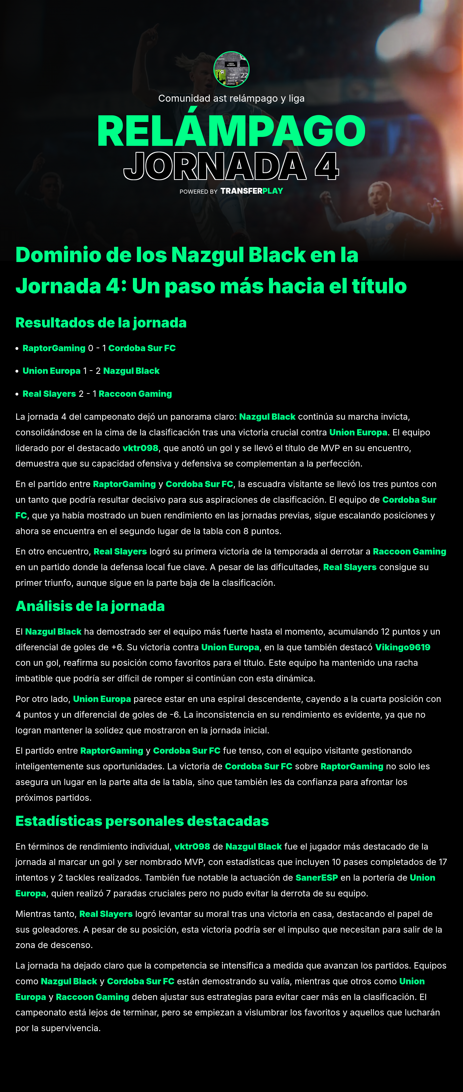 Con una asistencia brillante y un rendimiento defensivo excepcional, Zannouti4 fue nombrado MVP en la victoria de 2-1 frente a RaptorGaming. Su habilidad para conectar con sus compañeros marcó la diferencia en un partido reñido.