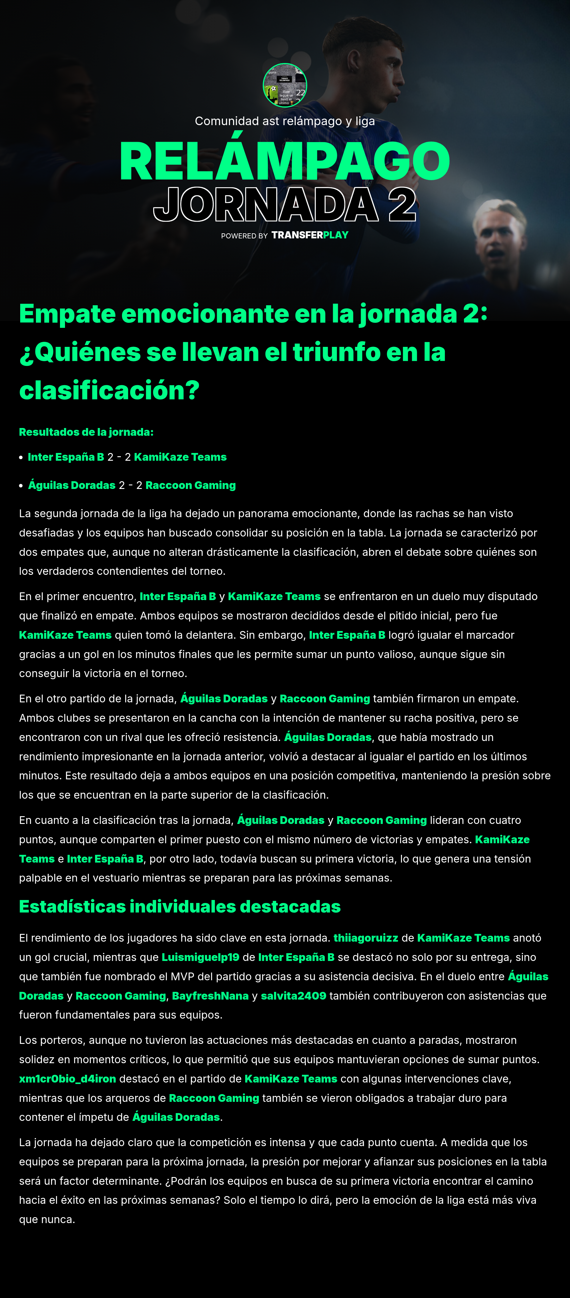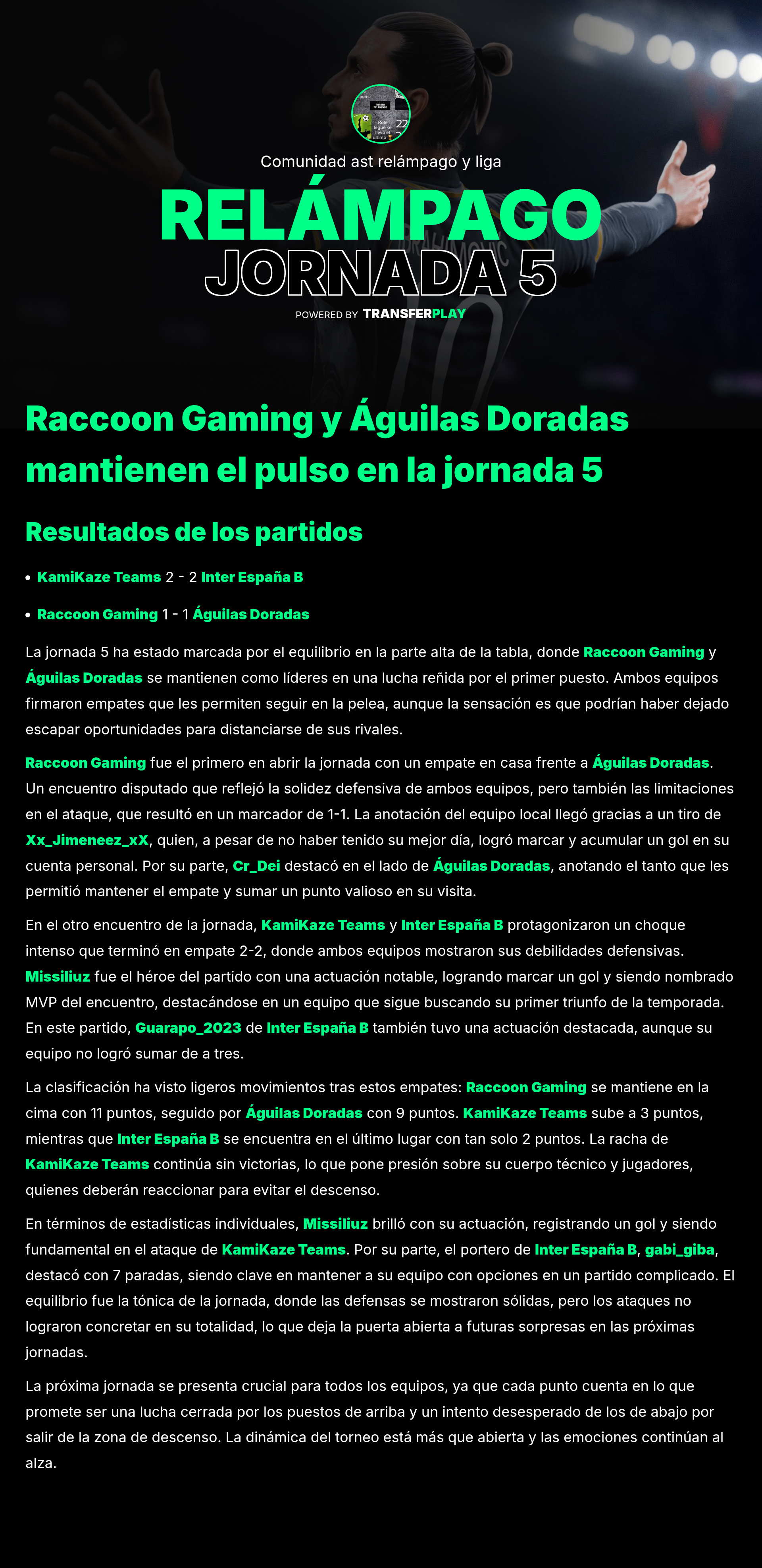 En el mismo partido, yung-bio31 también brilló al aportar un gol y una asistencia, contribuyendo al festín goleador de AGUILAS DORADAS. ¡Un rendimiento que no se puede pasar por alto!